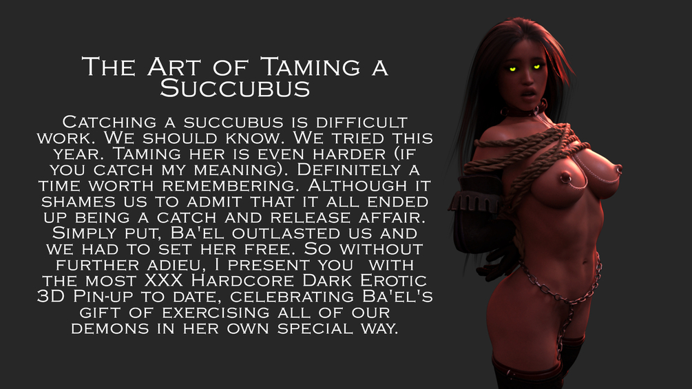Catching a succubus is difficult work. We should know. We tried this year. Taming her is even harder (if you catch my meaning). Definitely a time worth remembering. Although it shames us to admit that it all ended up being a catch and release affair. Simply put, Ba’el outlasted us and we had to set her free. So without further adieu, I present you with the most XXX Hardcore Dark Erotic 3D Pin-Up to date, celebrating Ba’el’s gift of exercising all of our demons in her own special way.